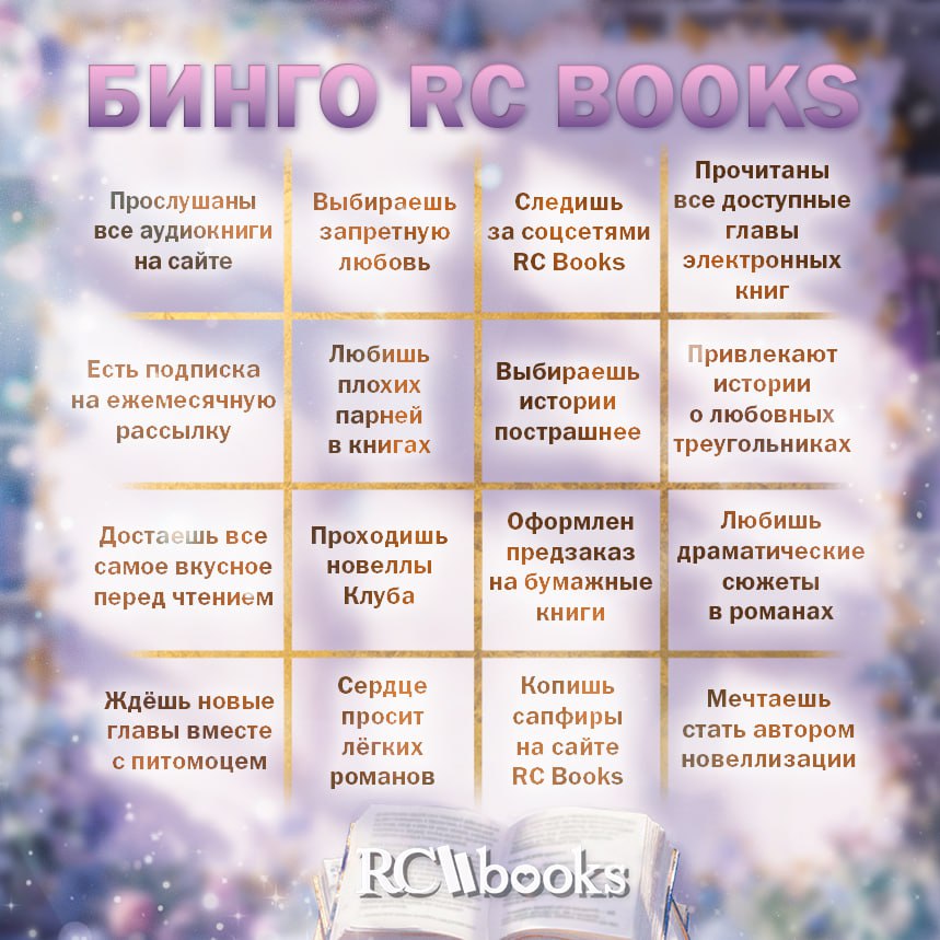 🎯 Играем в книжное бинго от RС Books! Отмечайте клеточки, которые, как вам кажется, вам подходят. Возможно, вы соберёте одно бинго, а может, даже несколько!
