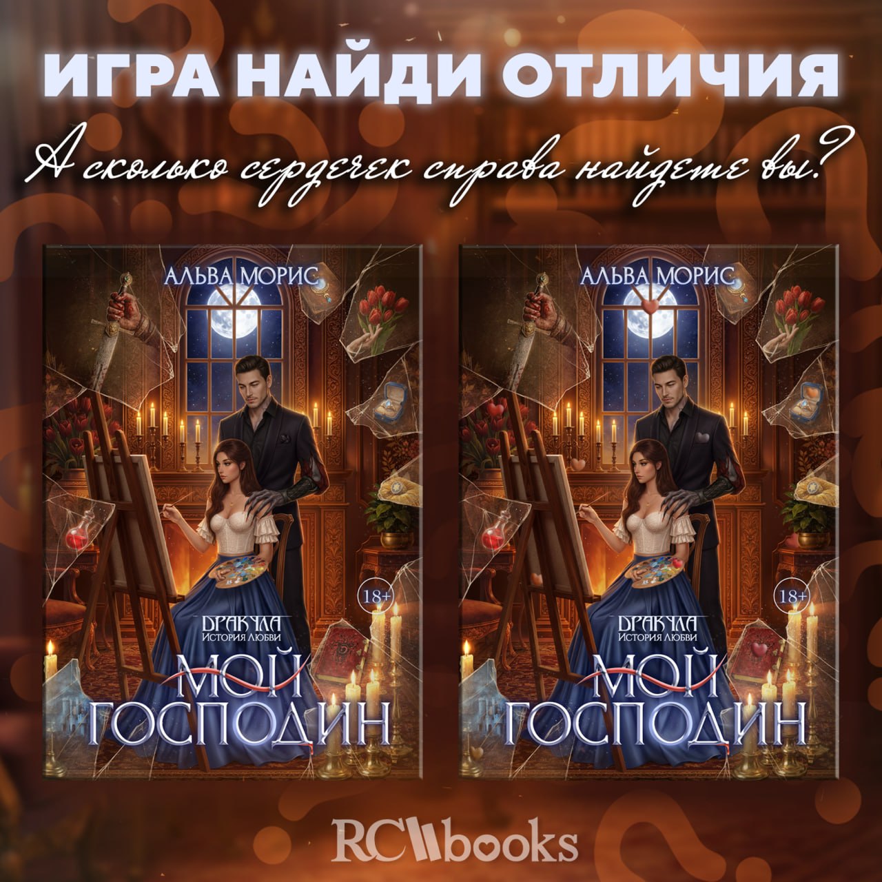 Мы приготовили для вас игру-головоломку по обложке книги «Дракула. История Любви: Мой Господин». На левой картинке всё в порядке, но с правой… что-то явно не так. Говорят, там спрятались сердечки — символы того самого чувства, которое Влад пронёс к своей возлюбленной сквозь века. Ну не чудесно ли? 💘